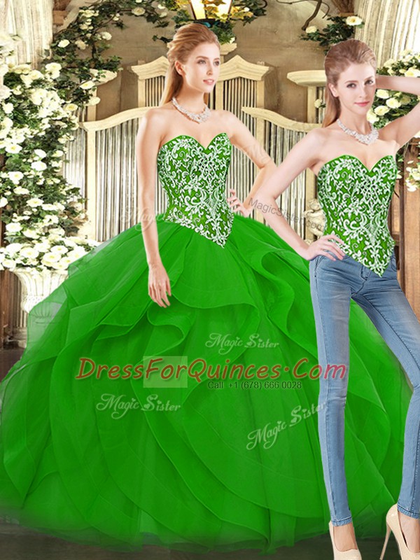 Amazing Green Sweetheart Lace Up Beading and Ruffles 15th Birthday Dress Sleeveless