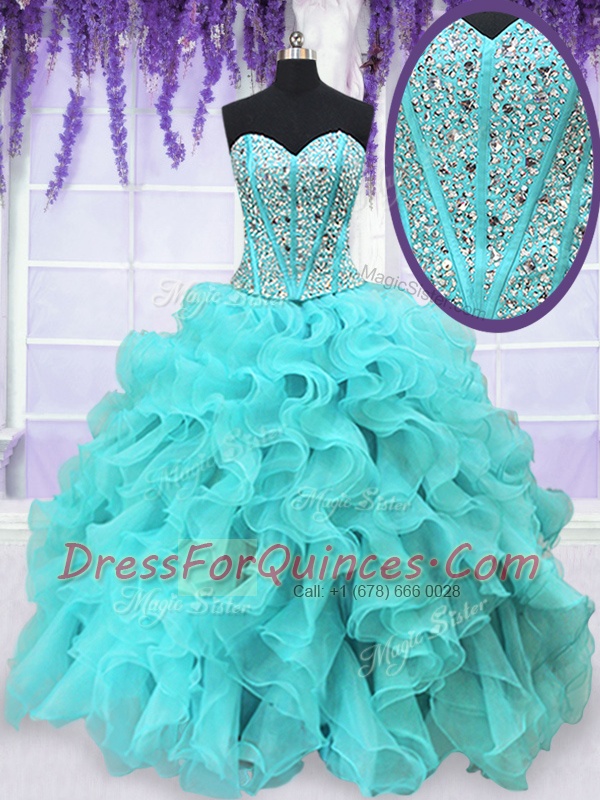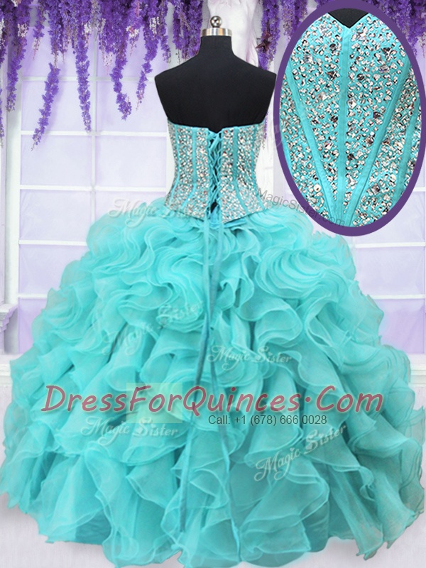 Aqua Blue Sweetheart Lace Up Beading and Ruffles Sweet 16 Dresses Sleeveless