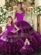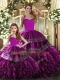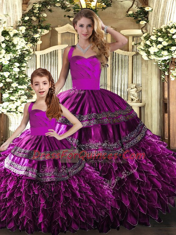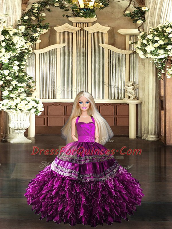 Best Selling Fuchsia Organza Lace Up Halter Top Sleeveless Floor Length Quinceanera Dress Embroidery and Ruffles