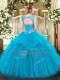 Blue Sleeveless Floor Length Beading and Ruffles Lace Up Sweet 16 Dresses