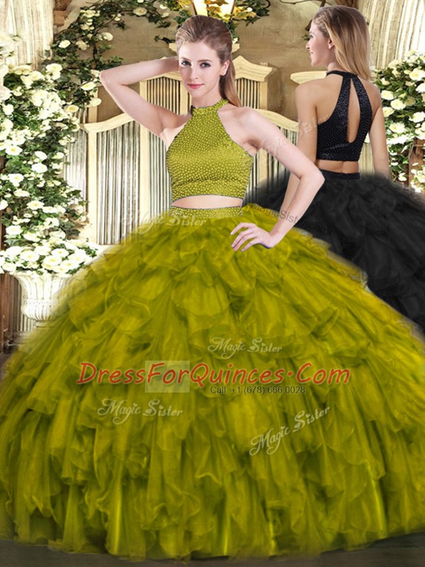 Captivating Olive Green Halter Top Backless Beading and Ruffles Quinceanera Dresses Sleeveless