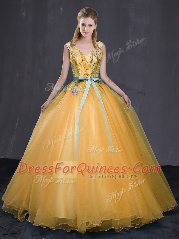 Chic Gold Tulle Lace Up V-neck Sleeveless Floor Length Quinceanera Gowns Appliques and Belt