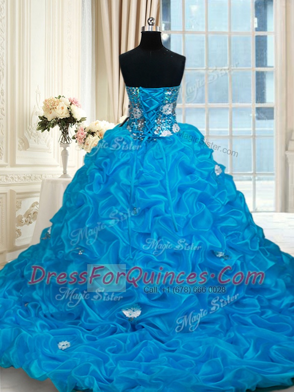 Chic Sweetheart Sleeveless Organza Quince Ball Gowns Beading and Pick Ups Brush Train Lace Up