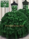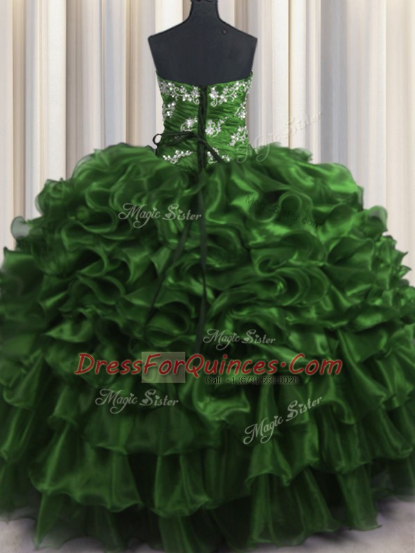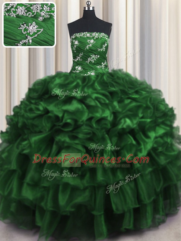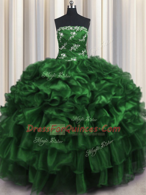 Classical Dark Green Organza Lace Up Strapless Sleeveless Floor Length Sweet 16 Dress Appliques and Ruffles and Ruffled Layers