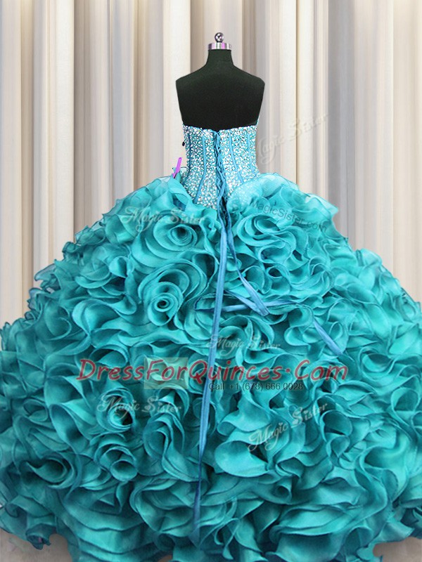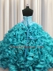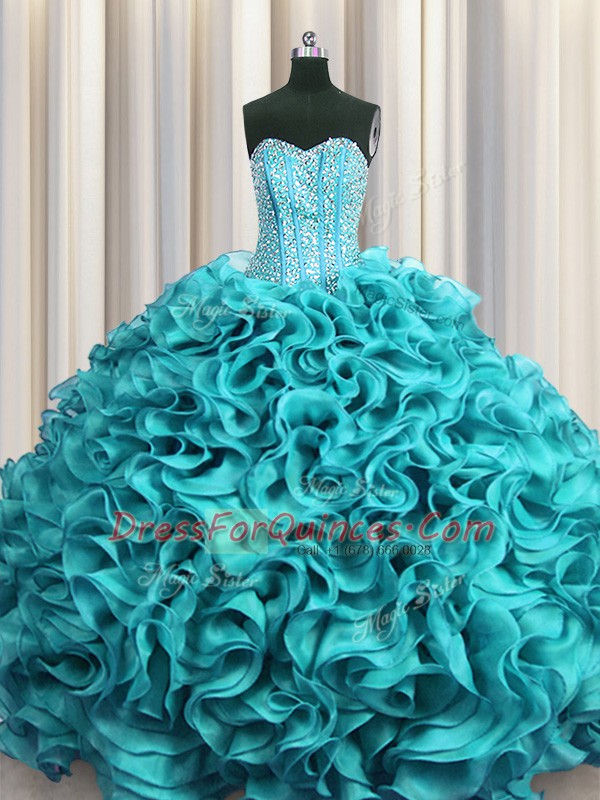 Classical Visible Boning Sweetheart Sleeveless Quinceanera Dresses Floor Length Beading and Ruffles Aqua Blue Organza