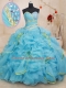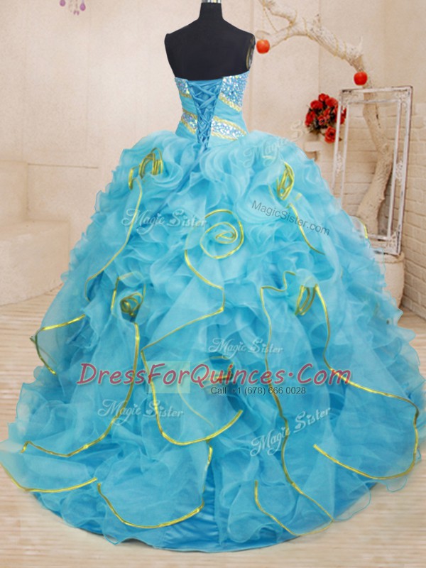 Comfortable Organza Sweetheart Sleeveless Brush Train Lace Up Beading and Ruffles Quince Ball Gowns in Baby Blue