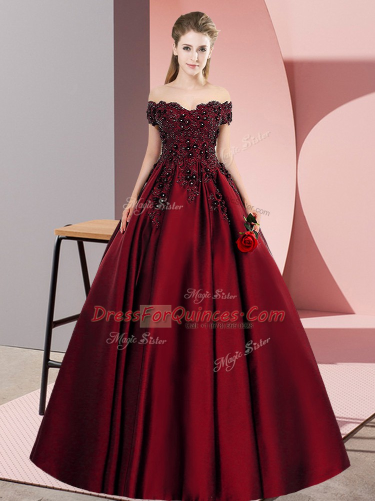 Deluxe A-line Sweet 16 Dresses Wine Red Off The Shoulder Satin Sleeveless Floor Length Zipper