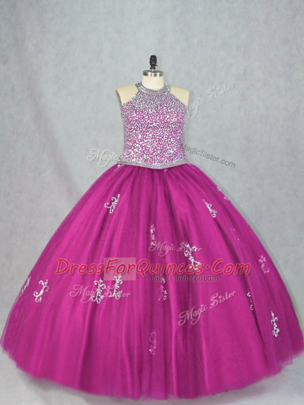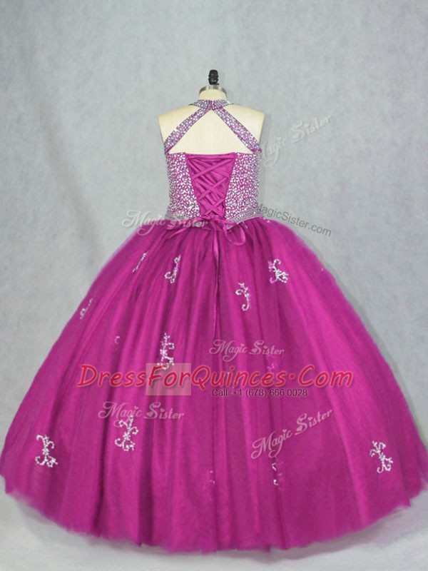 Discount Ball Gowns Quinceanera Gown Fuchsia Halter Top Tulle Sleeveless Floor Length Lace Up
