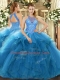 Dynamic Teal Organza Lace Up Ball Gown Prom Dress Sleeveless Floor Length Beading and Ruffles