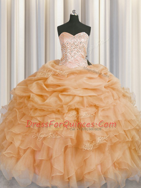 Elegant Gold Lace Up Sweetheart Beading and Ruffles Quinceanera Dress Organza Sleeveless