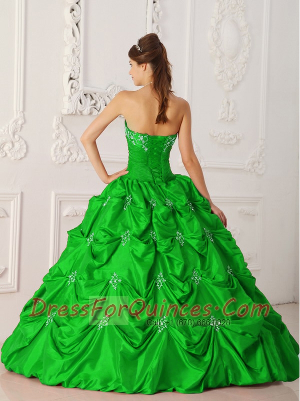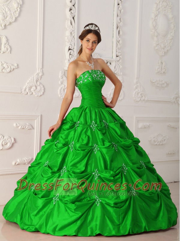 Elegant Green Ball Gown Strapless Quinceanera Dress with Taffeta Appliques and Beading