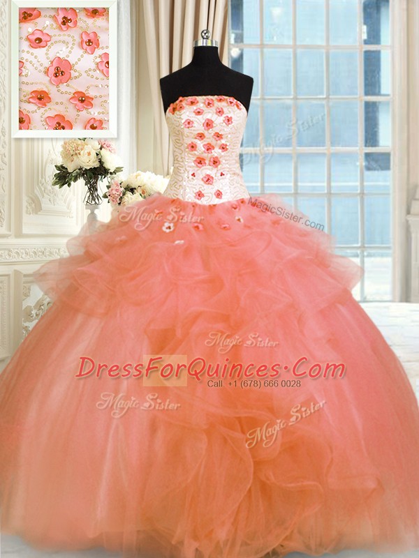 Elegant Orange Strapless Lace Up Pick Ups and Hand Made Flower Quinceanera Dresses Sleeveless
