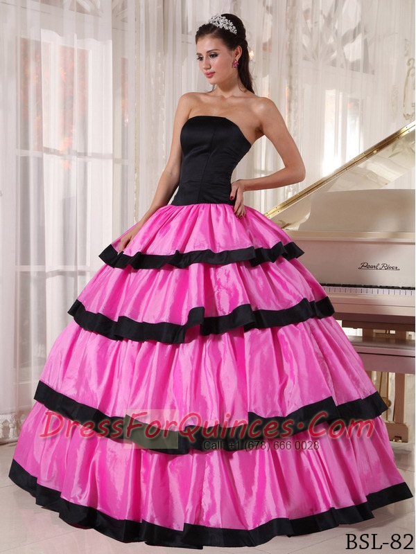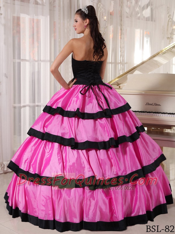 Elegant Rose Pink and Black Ball Gown Strapless Floor-length Taffeta Quinceanera Dress