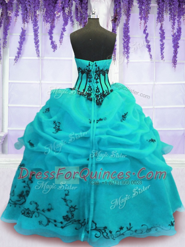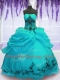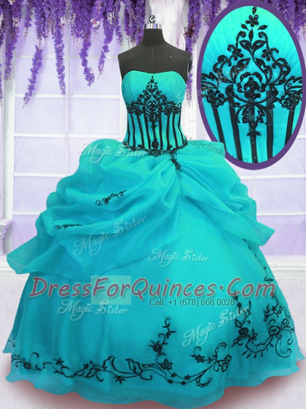 Elegant Strapless Sleeveless Quince Ball Gowns Floor Length Embroidery Turquoise Organza