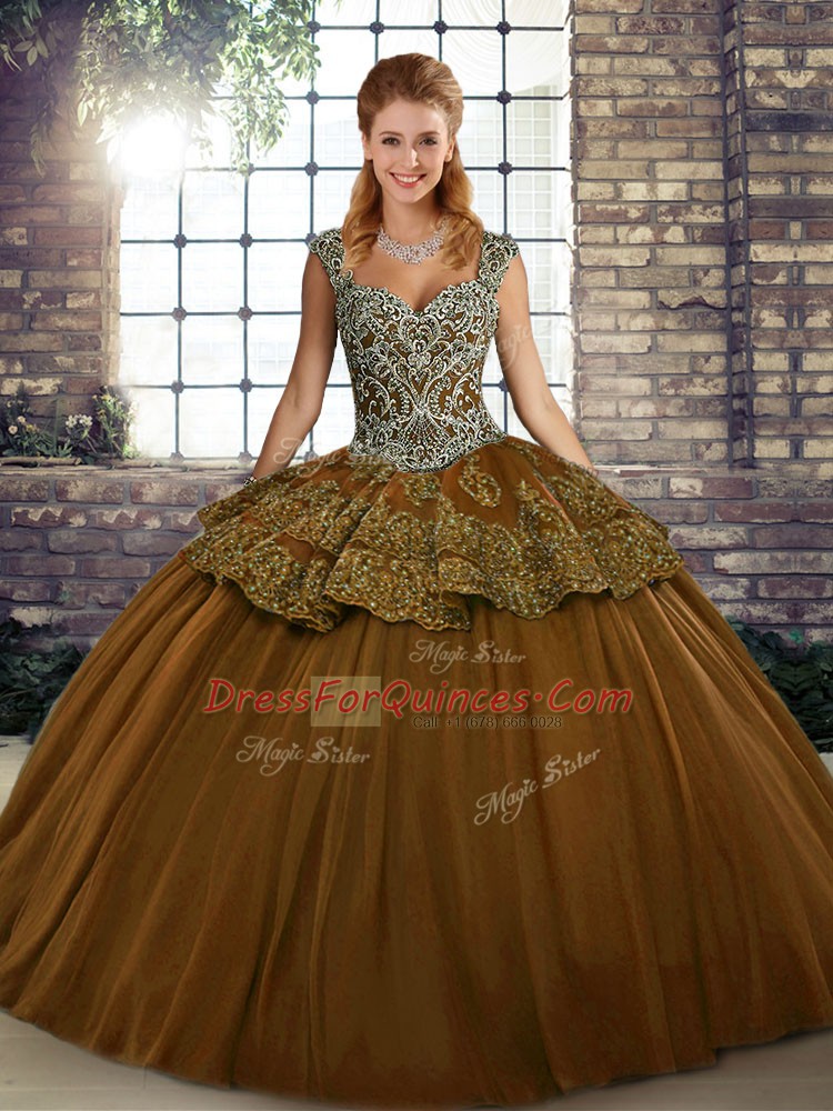 Fabulous Brown Sleeveless Floor Length Beading and Appliques Lace Up Sweet 16 Dresses