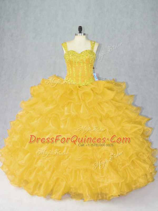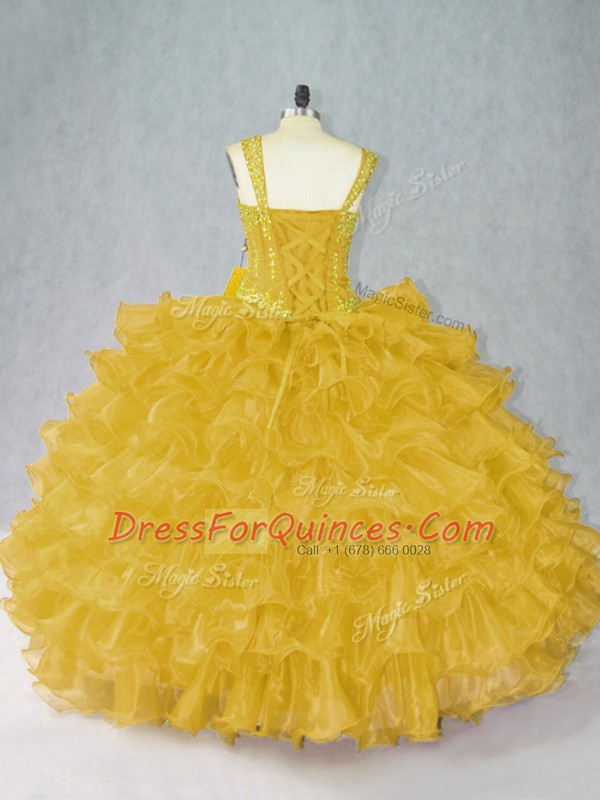 Fabulous Gold Organza Lace Up Ball Gown Prom Dress Sleeveless Floor Length Beading and Ruffles