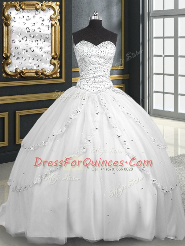 Fancy With Train Ball Gowns Sleeveless White Sweet 16 Dresses Brush Train Lace Up