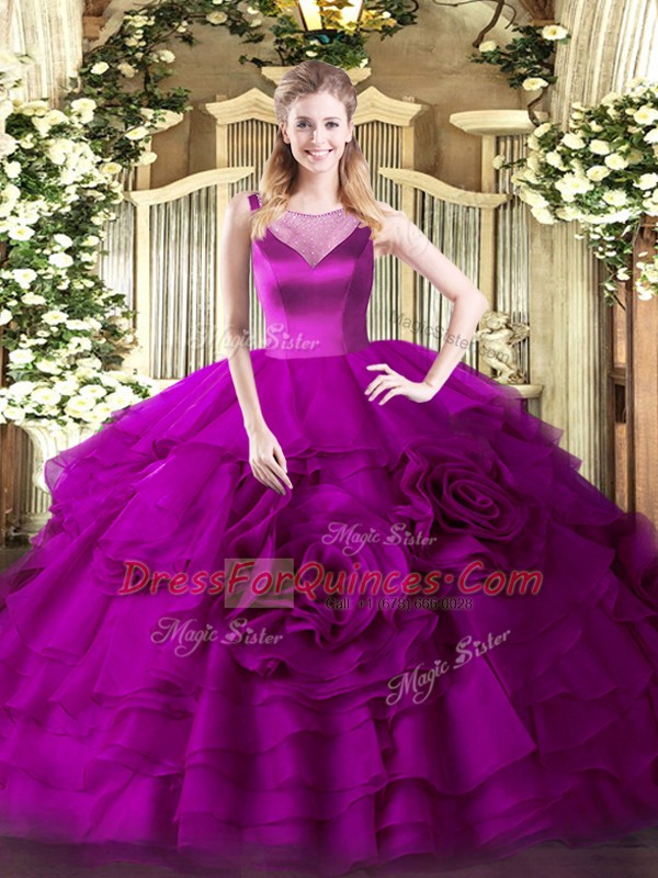 Fantastic Fuchsia Scoop Side Zipper Beading and Ruffled Layers Sweet 16 Dress Sleeveless