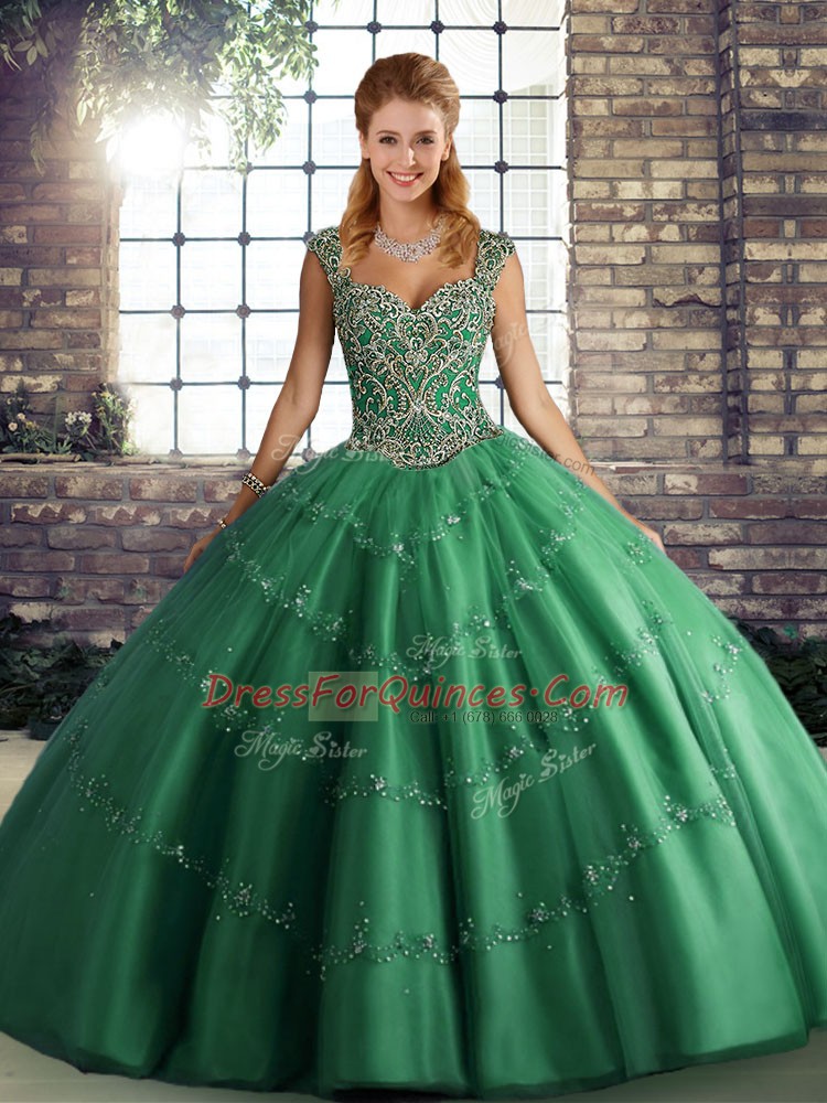 Fantastic Green Tulle Lace Up Ball Gown Prom Dress Sleeveless Floor Length Beading and Appliques