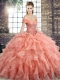 Fitting Peach Organza Lace Up Sweet 16 Dresses Sleeveless Brush Train Beading and Ruffles
