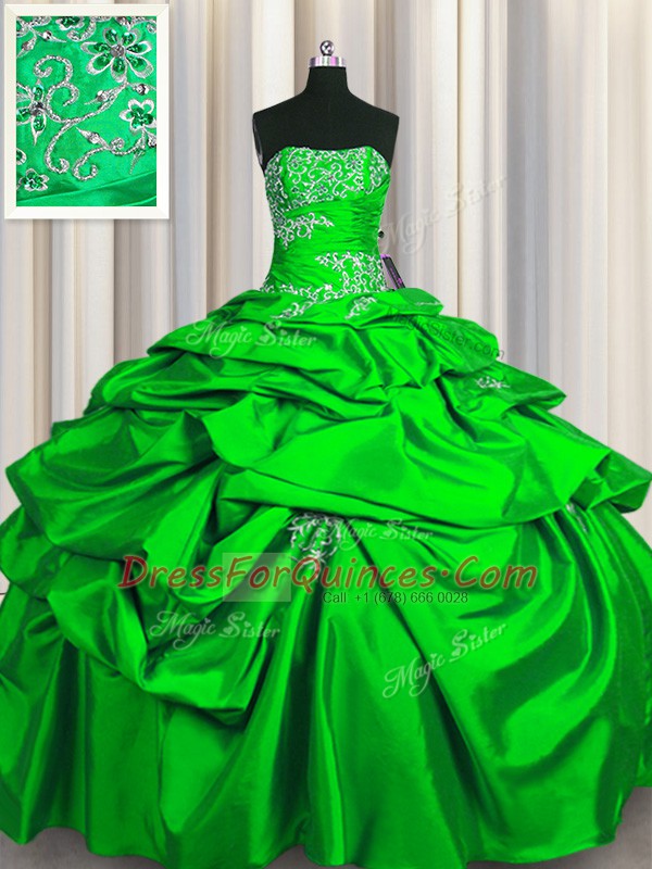 Floor Length Lace Up Sweet 16 Quinceanera Dress Green for Military Ball and Sweet 16 and Quinceanera with Appliques and Pick Ups