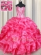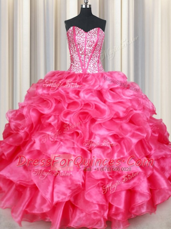 Hot Pink Organza Lace Up Sweet 16 Dress Sleeveless Floor Length Beading and Ruffles