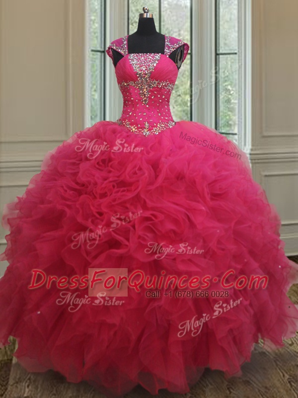 Hot Selling Hot Pink Quinceanera Gown Military Ball and Sweet 16 and Quinceanera and For with Beading and Ruffles Square Cap Sleeves Lace Up