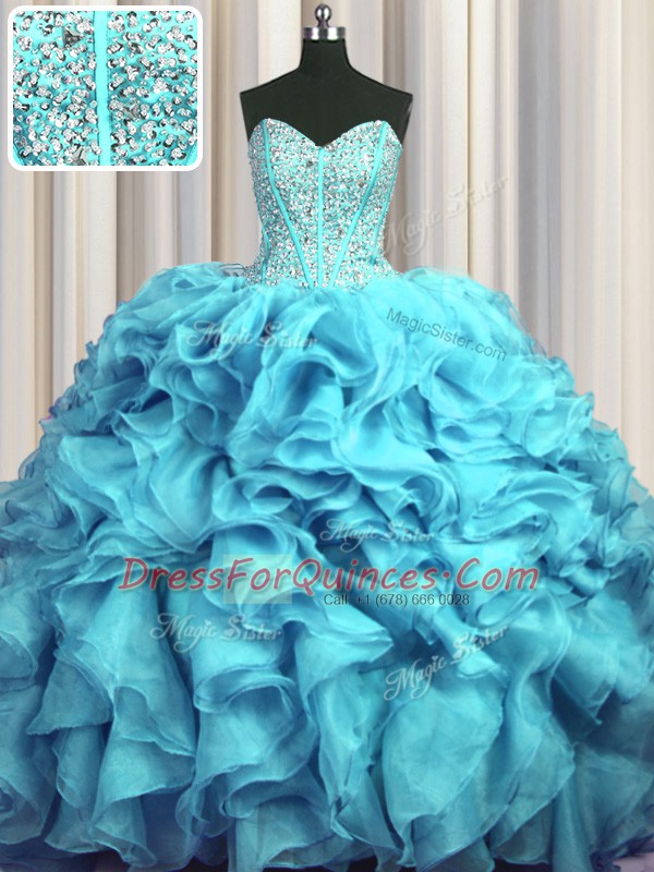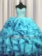 Hot Selling Visible Boning Bling-bling Sweetheart Sleeveless Organza 15 Quinceanera Dress Beading and Ruffles Brush Train Lace Up