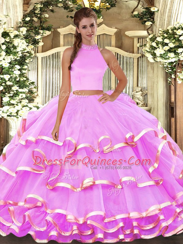 Lilac Backless 15 Quinceanera Dress Beading and Ruffled Layers Sleeveless Floor Length