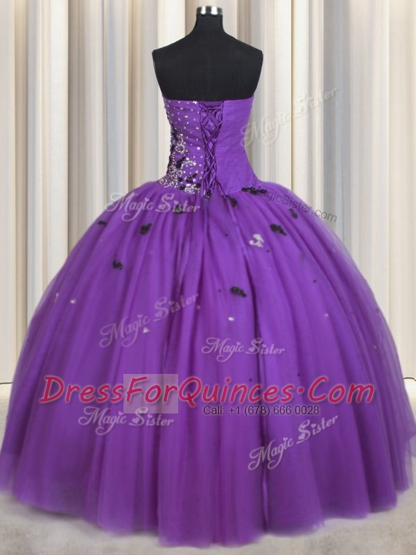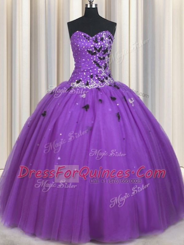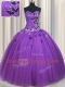 Lovely Sweetheart Sleeveless Quince Ball Gowns Floor Length Beading and Appliques Eggplant Purple Tulle