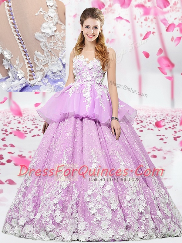 Low Price Lilac Ball Gowns Organza and Tulle Scoop Sleeveless Lace and Appliques Floor Length Lace Up 15 Quinceanera Dress