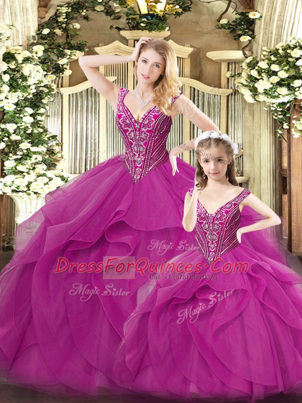Modern Fuchsia Quinceanera Dress Military Ball and Sweet 16 and Quinceanera with Beading and Ruffles Straps Sleeveless Lace Up