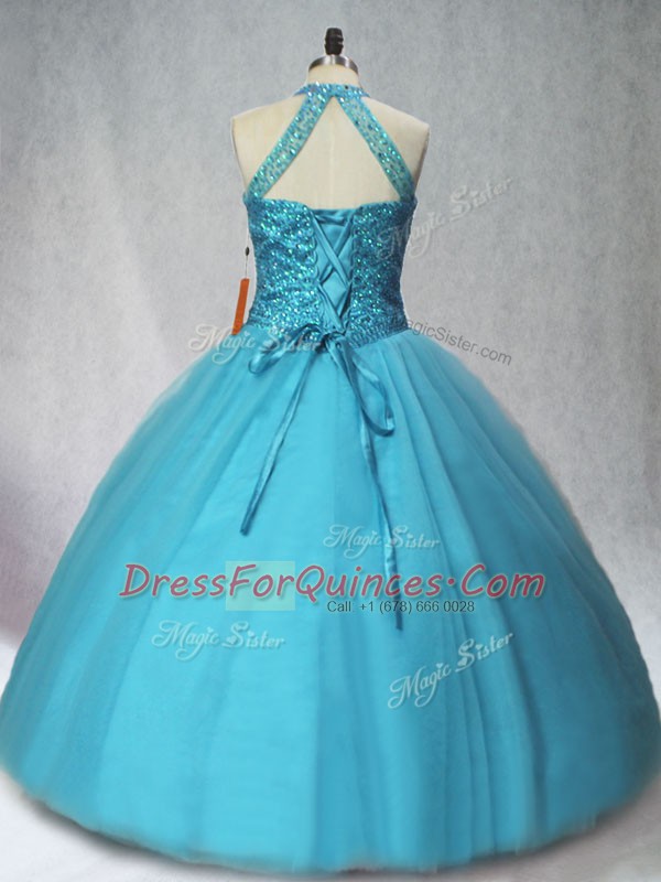 Modern Teal Tulle Lace Up 15 Quinceanera Dress Sleeveless Floor Length Beading
