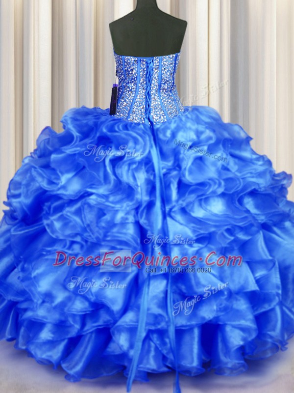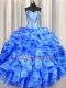 On Sale Blue Sleeveless Floor Length Beading and Ruffles Lace Up Sweet 16 Dress