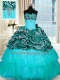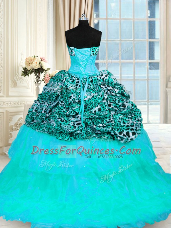 Printed Lace Up Quinceanera Gown Aqua Blue for Military Ball and Sweet 16 and Quinceanera with Beading and Ruffled Layers Sweep Train