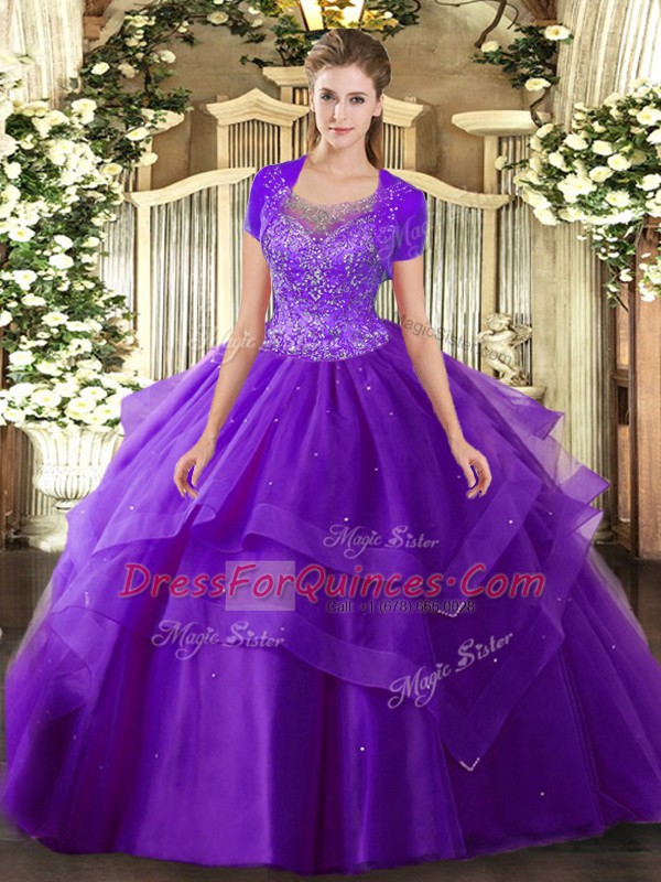 Purple Sleeveless Floor Length Beading and Ruffles Clasp Handle Sweet 16 Quinceanera Dress