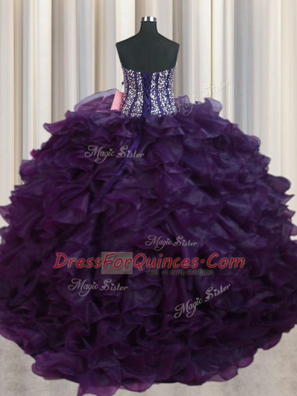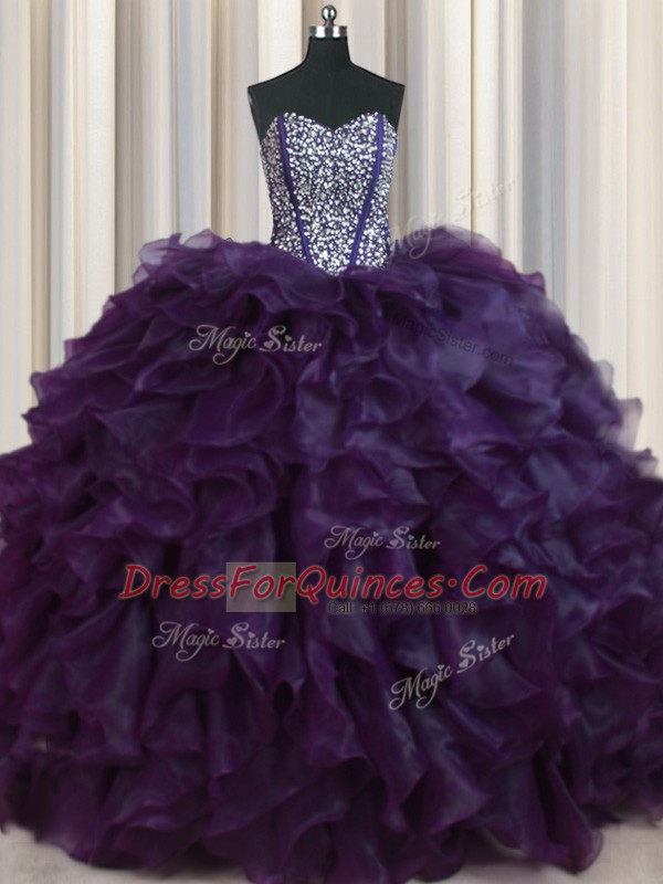 Romantic Visible Boning Bling-bling Sweetheart Sleeveless Brush Train Lace Up Quinceanera Dresses Dark Purple Organza