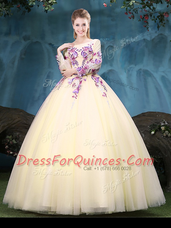 Scoop Light Yellow Long Sleeves Floor Length Appliques Lace Up Quinceanera Gown