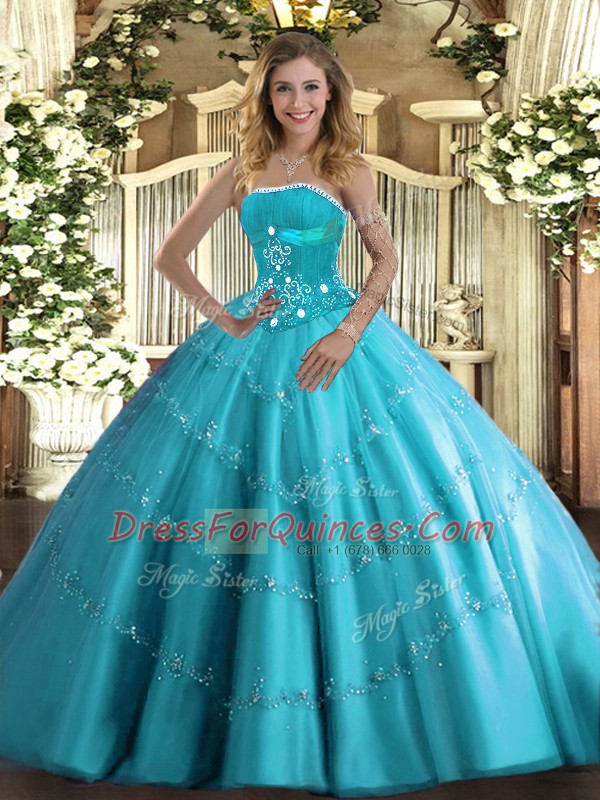 Simple Floor Length Aqua Blue 15 Quinceanera Dress Tulle Sleeveless Beading and Appliques and Ruffled Layers