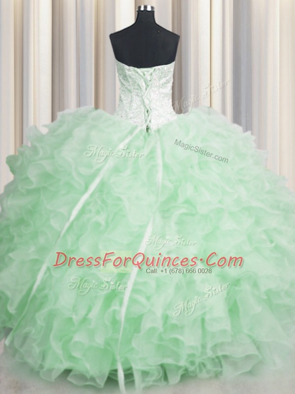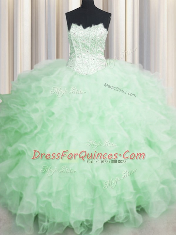 Stylish Scalloped Visible Boning Apple Green Sleeveless Beading and Ruffles Floor Length Quinceanera Gowns