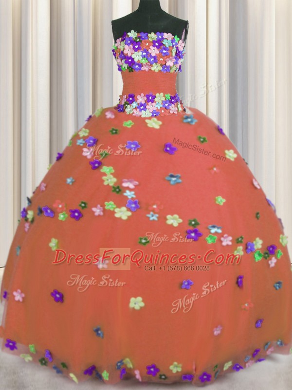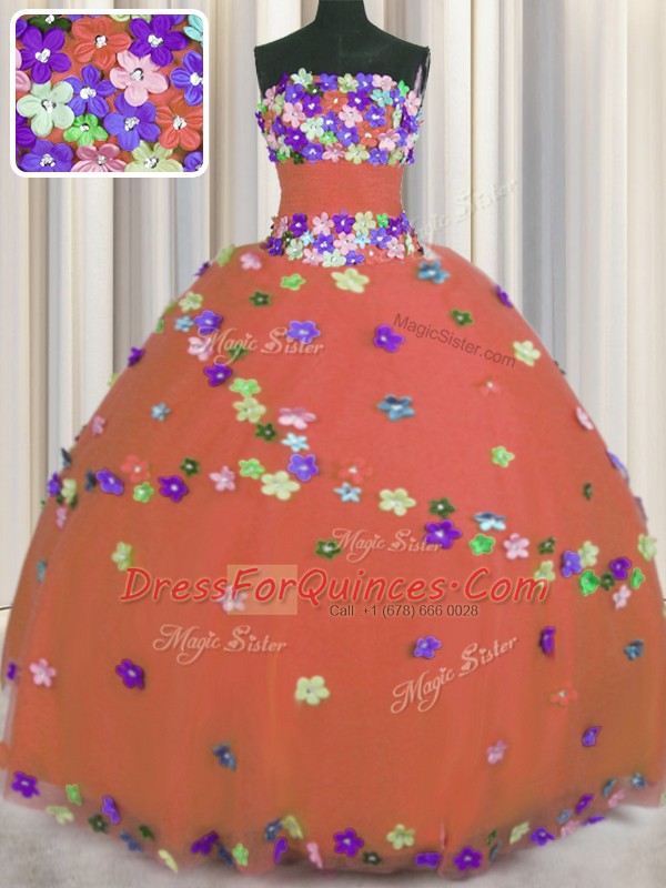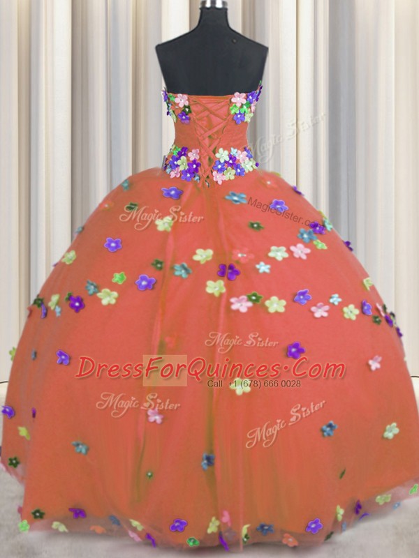 Sumptuous Strapless Sleeveless Tulle Quince Ball Gowns Hand Made Flower Lace Up