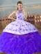 Super Embroidery and Ruffles Sweet 16 Dress Blue Lace Up Sleeveless Court Train
