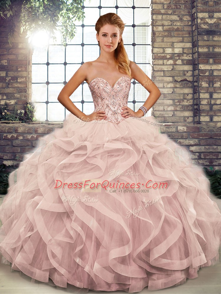 Sweetheart Sleeveless Tulle Quinceanera Dresses Beading and Ruffles Lace Up