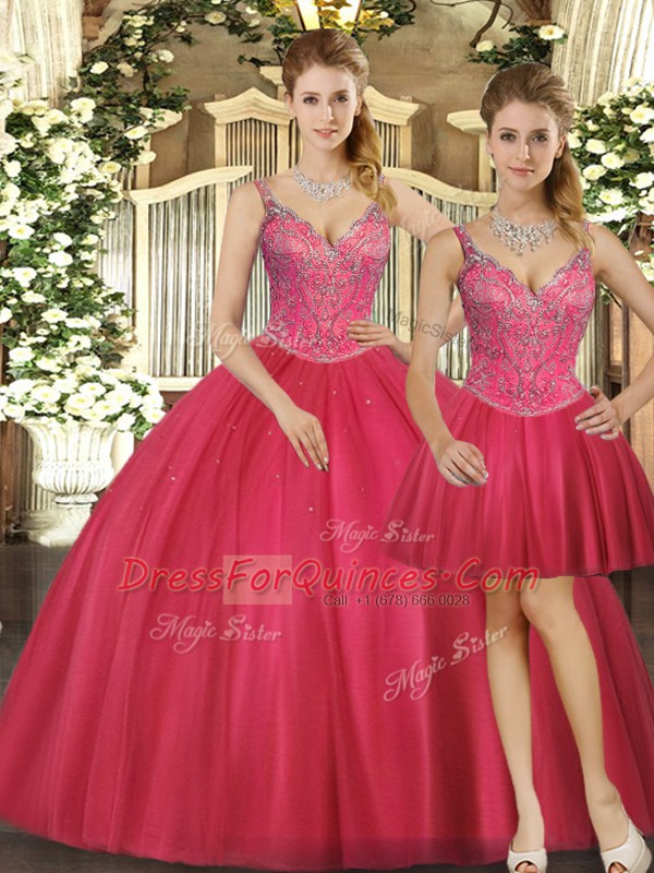 Top Selling Beading Quinceanera Dresses Hot Pink Lace Up Sleeveless Floor Length