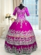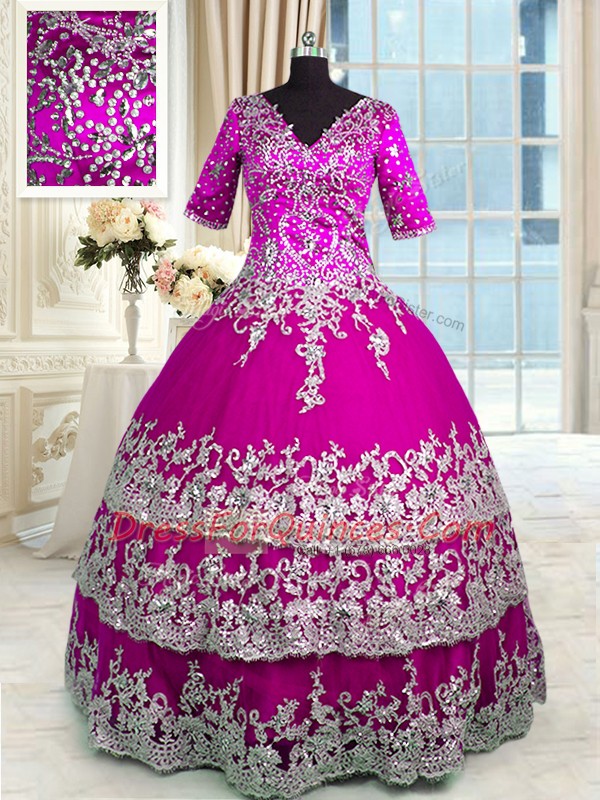 Traditional Fuchsia Zipper Quinceanera Gowns Beading and Appliques and Ruffled Layers Half Sleeves