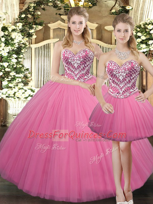 Trendy Sweetheart Sleeveless Quinceanera Dresses Floor Length Beading Rose Pink Tulle