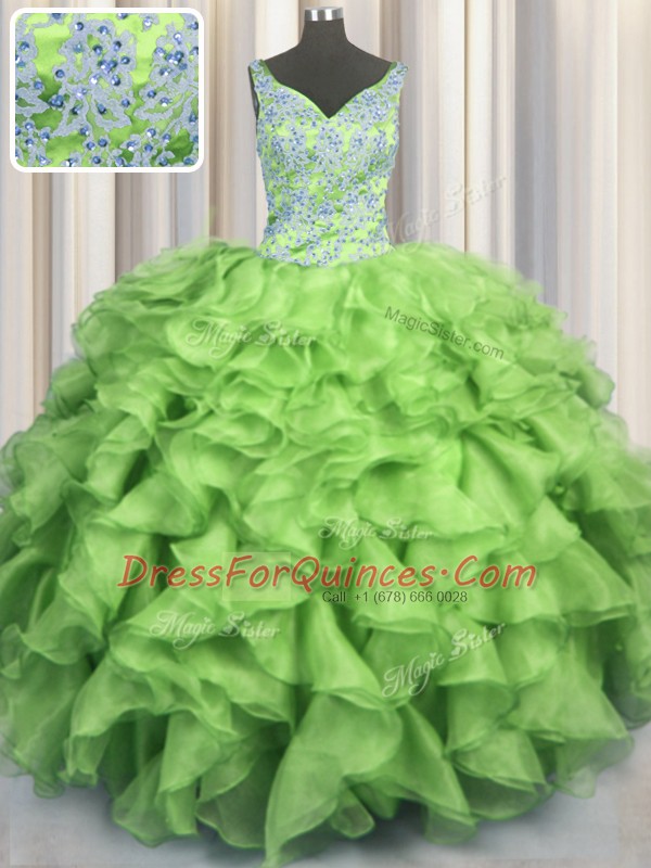 V Neck Sleeveless Beading and Ruffles Lace Up Sweet 16 Dresses
