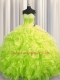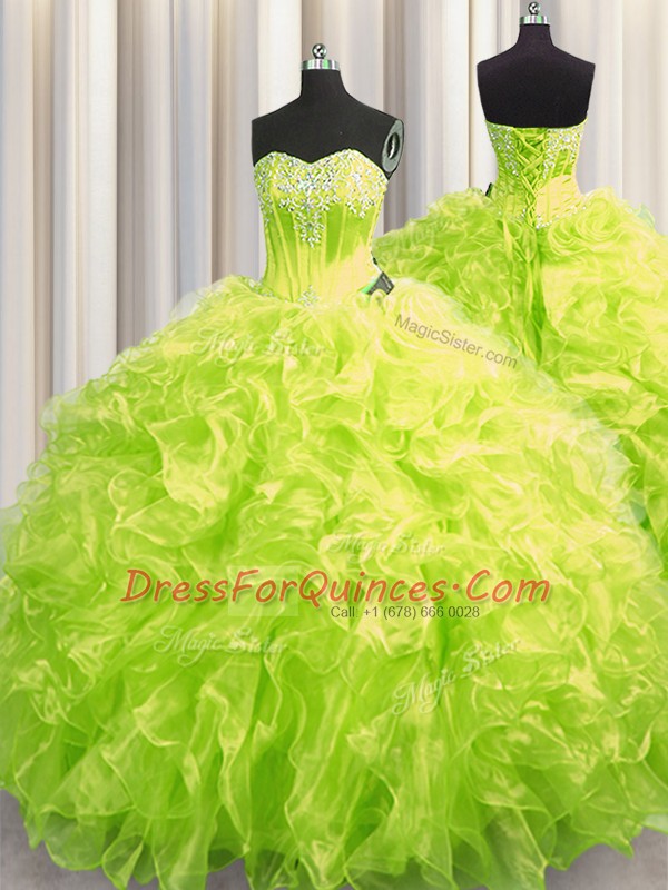Yellow Green Organza Lace Up Quinceanera Dresses Long Sleeves Brush Train Beading and Ruffles