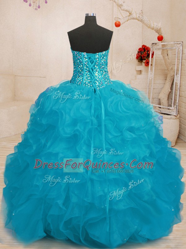 Fashionable Aqua Blue Organza Lace Up Sweetheart Sleeveless Floor Length Vestidos de Quinceanera Beading