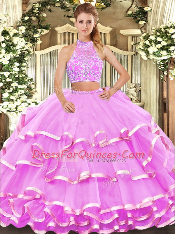 Halter Top Sleeveless Sweet 16 Dresses Floor Length Beading and Ruffled Layers Lilac Tulle